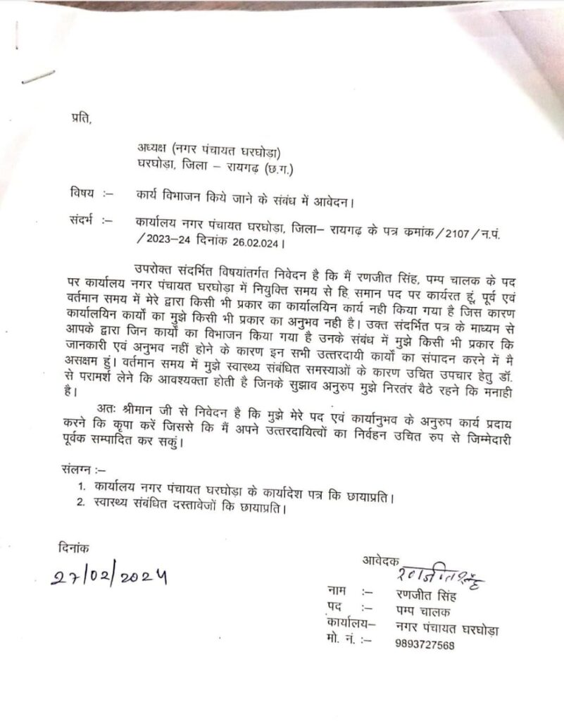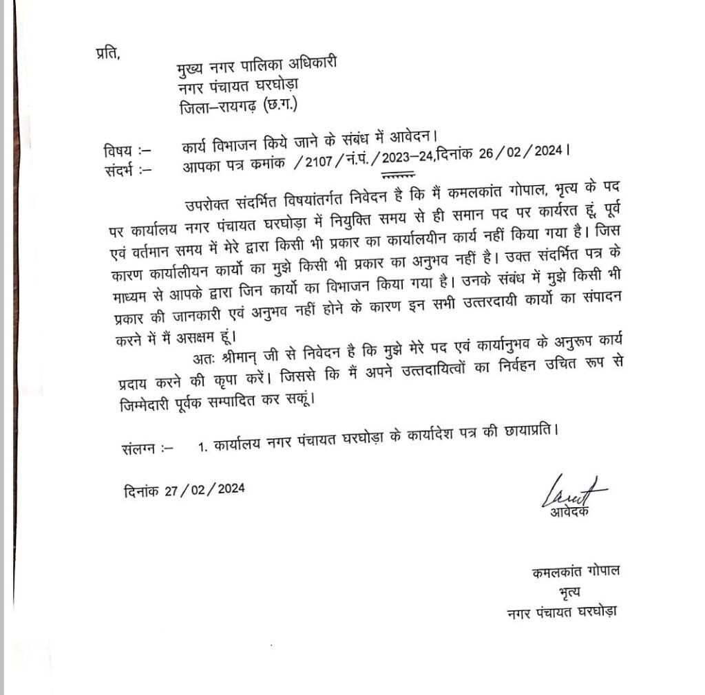 कार्य क्षेत्र में बदलाव के बाद भृत्य के पद पर पदस्थ कमल कांत गोपाल जिन्हें अब नए जिम्मेदारी के साथ राजस्व , भवन निर्माण एनओसी, स्टोर नल तथा अन्य विभागों का प्रभार दिए है। यह पद मिलने पर उन्होंने मार्मिकता भरा संवेदनशील पत्र सीएमओ को प्रेषित किया है।जिसमें उन्होंने बताया की नियुक्ति के बाद से सामान्य पद में वह कार्यरत है, अब तक किसी भी प्रकार का कोई भी कार्यालयीन कार्य नहीं किया गया है,और अनुभव हीन , जिसके चलते वह वक्त जिम्मेदारी में कार्य करने के लिए सक्षम बताते हुए पूर्व की भांति करने की मांग किया है। इसी तरह पंप चालक रजनीश सिंह ने भी पत्र लिखा है। जिसमें उनके द्वारा इसी तरह कार्य से पृथक करने का निवेदन किया गया इसके साथ ही उन्होंने स्वास्थ्यगत समस्या उल्लेख करते हुए बैठक रहकर कार्य करने से चिकित्सक द्वारा मनाही किया गया। बहरहाल मानवता भरे पत्रों के बाद भी सीएमओ ने संज्ञान नहीं लिया है ।
