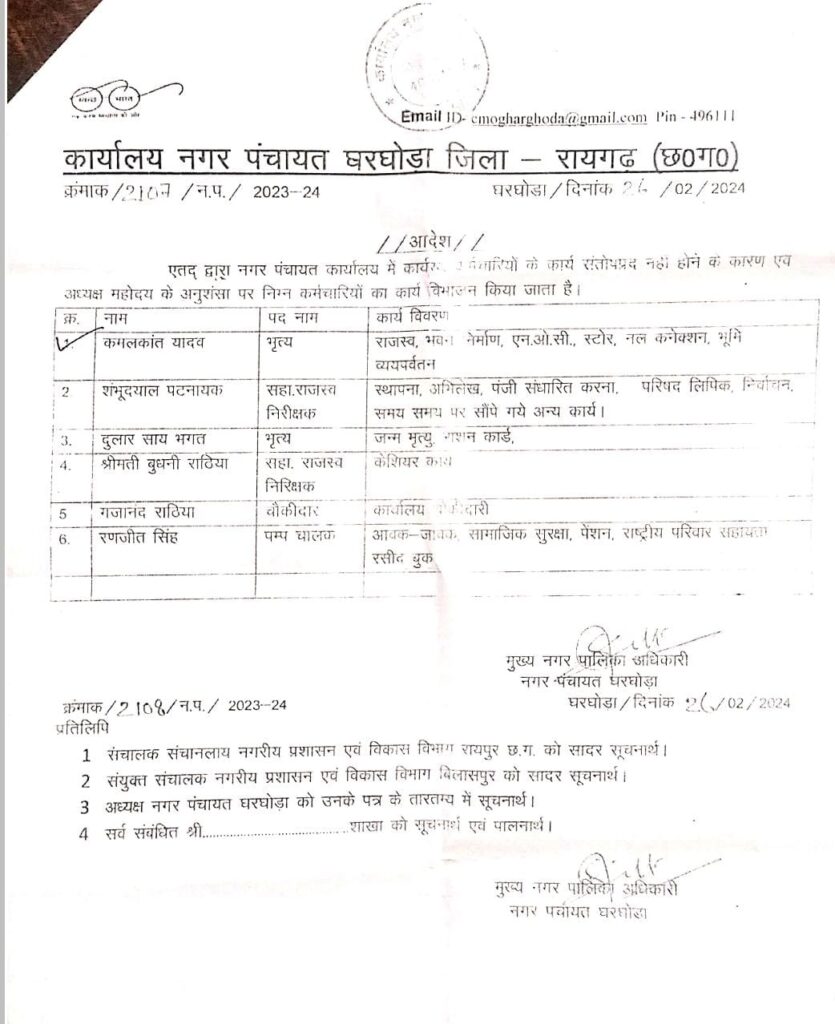 दरअसल घरघोड़ा में बहुमत के आधार पर नगर पंचायत की कुर्सी में कांग्रेस की सरकार काबिज है। जबकि इससे पूर्व बहुमत नही होने के बाद भी नगर पंचायत की कमान अध्यक्ष के तौर पर भाजपा में कांग्रेस के क्रास वोटिंग से सफल हो पाई है। ऐसे में यहां नूराकुस्सी का खेल चला आ रहा है। इन सभी के बीच अब वर्तमान में ताजा तरीन प्रकरण मे नगर पंचायत के कर्मचारियों के प्रभार में फेरबदल करने को लेकर सामने आया है जिसमें विश्वत सूत्रों के मुताबिक पांच माह पहले नगर पंचायत अध्यक्ष द्वारा सीएमओ से खुद कर्मचारियों के प्रभार में फेरबदल करने की मांग करते हुए पत्र लिखे थे, अब जब चुनावी माहौल में लोकसभा चुनाव के लिए आदर्श आचार संहिता लगना है, इस दरम्यान करीब 5 महीने बाद होने सीएमओ ने पत्र पर संज्ञान लेते हुए कर्मचारियों के प्रभार को फेर बदल दिया है। सीएमओ द्वारा कर्मचारियों के प्रभार में बदलाव किया गया है जिसमें भृत्य जैसे भी कर्मचारी शामिल है।