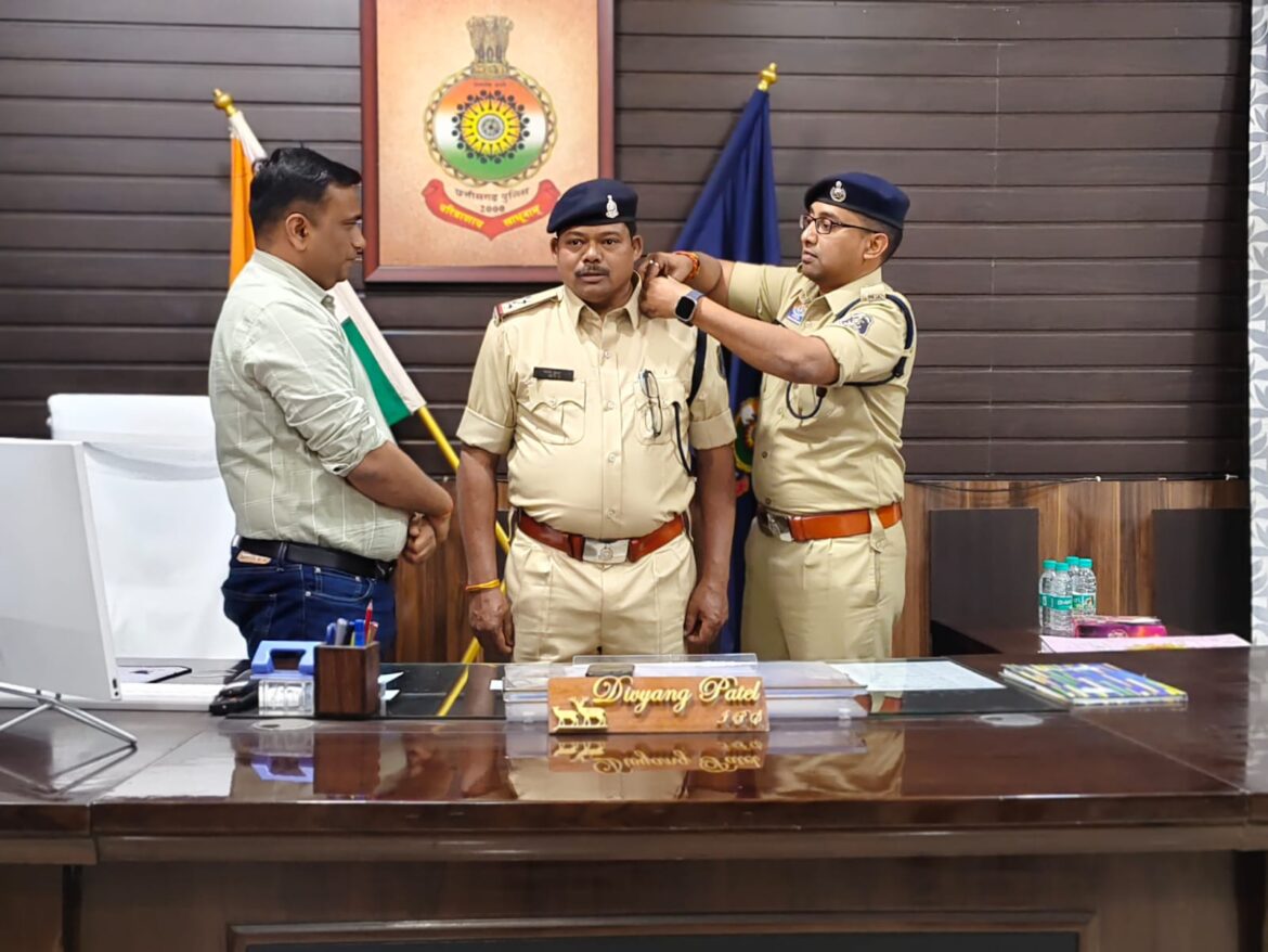 रायगढ़। जिले में पदस्थ सहायक उप निरीक्षक विजय कुमार एक्का को आज पुलिस अधीक्षक कार्यालय में पदोन्नति प्रदान की गई। एसपी दिव्यांग कुमार पटेल और एडिशनल एसपी आकाश मरकाम ने विजय कुमार एक्का के कंधों पर उप निरीक्षक का स्टार लगाकर उन्हें नई जिम्मेदारी सौंपी।
