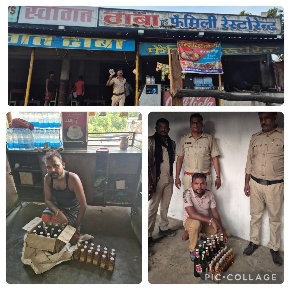 ढाबा संचालक नीरज मिश्रा आत्मज गणेश मिश्रा के अधिपत्य से काउंटर में रखी हुई मेकडावेल नंबर वन विहस्की एवं किंग फिशर बियर बॉटल समेत कुल 11 बल्क लीटर विदेशी शराब (उड़ीसा में विक्रय हेतु लेबल लगी ) जप्त की गई। आरोपी के विरुद्ध आबकारी अधिनियम के तहत ग़ैरजमानती धारा में प्रकरण क़ायम किया गया और जेल दाखिल की कार्यवाही की गई।