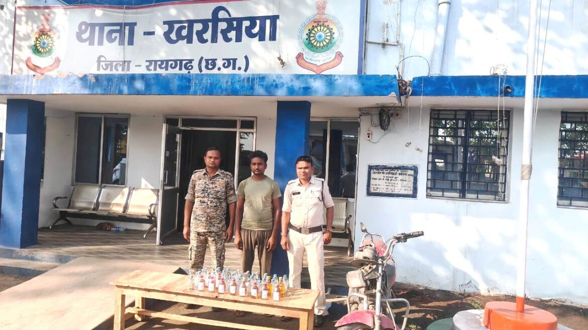 इसी क्रम में आज खरसिया पुलिस को पेट्रोलिंग दौरान मुखबीर से सूचना मिली कि हेमंत डनसेना अपने ढाबा में अवैध बिक्री के लिए मोटर सायकल स्प्लेंडर पर शराब लेकर खरसिया से भालूनारा की ओर आ रहा है । सूचना पर खरसिया पुलिस मेन रोड़ चोढ़ा के पास घेराबंदी कर संदेही हेमंत डनसेना को हिरासत में लिया गया जिसके पास रखे बैग में रखे 35 पाव देसी प्लेन, 10 पाव जम्मू विस्की अंग्रेजी शराब एवं 02 पाव मैकडॉवेल नंबर वन शराब जुमला 45 पाव शराब कीमती 5,000 एवं शराब परिवहन में प्रयुक्त मोटरसाइकिल स्प्लेंडर सीजी 13 यू.बी. 7948 कीमती 20000 जप्त किया गया।