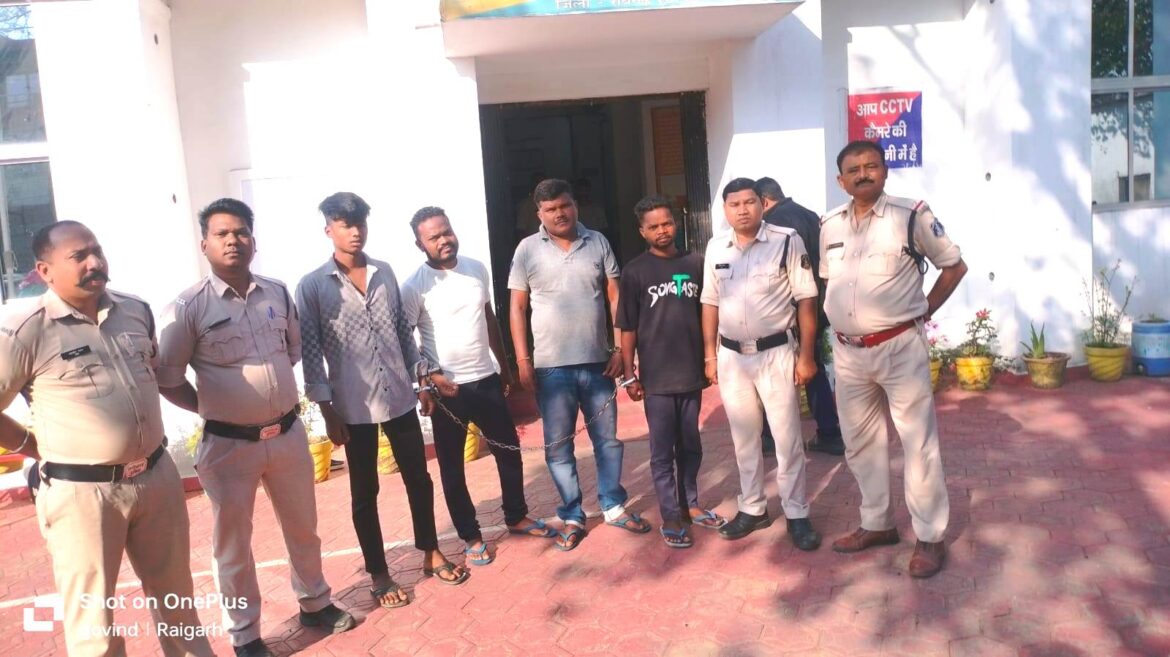 आज दोपहर मुखबीर सूचना पर मारपीट में शामिल फरार आरोपी- समीर उरांव पिता नवीन उरांव 18 साल ,राजू उरांव पिता सोनऊ उरांव 47 साल, शंकर उरांव पिता चैनलाल उरांव 36 साल , फोक्स उर्फ प्रकाश उरांव पिता बरातु उरांव 26 साल सभी निवासी मधुबन पारा रायगढ़ ,विधि के साथ संघर्षरत बालक को कोतवाली पुलिस द्वारा गिरफ्तार कर सक्षम न्यायालय रिमांड पर भेजा गया है ।